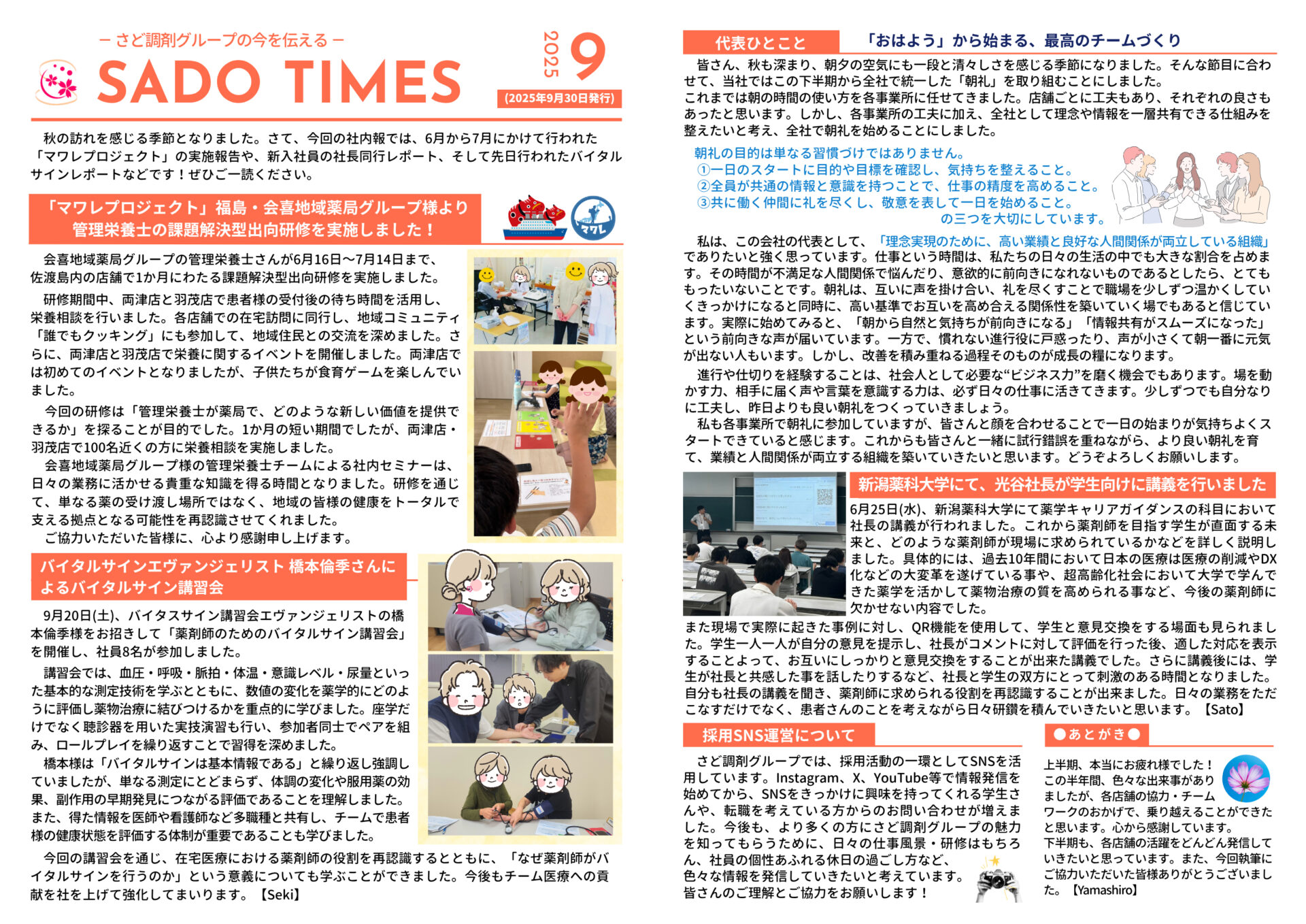 お知らせ 2025年10月15日 社内報更新! いつも採用サイトをご覧いただきありがとうございます。 さど調剤グループよりお知らせです! 1.社内報、最新号発行! 9月に社内報「SADO TIMES -さど調剤グループの今を伝える-」最新号を発行しました。 7月からの3ヶ月の活動として、マワレプロジェクト・社内研修・新入社員の社長同行レポートなど、社内の様々な「今」をお届けしています。 最新社内報は、こちら から!